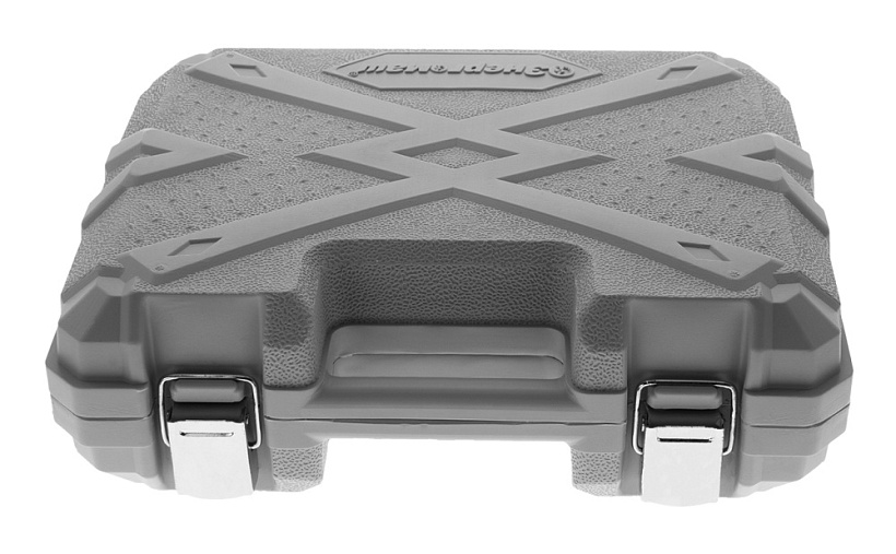 Прочный кейс, крепление для подвеса, ремешок для ношения инструмента на руке карабин-защелка и набор бит в комплекте.
