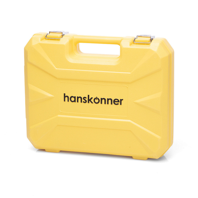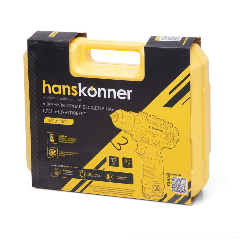 Hanskonner HCD1230R – универсальный аккумуляторный 12В двухскоростной шуруповерт. Модель обладает максимально сбалансированной компоновкой: небольшая толщина корпуса и рукояти позволяет эффективное использование в условиях с затрудненным доступом, а нейтральный центр тяжести, и обилие прорезиненных противоскользящих поверхностей способствуют надежному хвату, и лучшему контролю в процессе работы. Шуруповерт оснащен 12 В бесщеточным двигателем, характеризующимся на 30% лучшей производительностью в сравнении с коллекторными аналогами. Кроме того, бесщеточный двигатель отлично справляется с кратковременными перегрузками и не склонен к перегреву.   Модель имеет две скорости: режим пониженных оборотов (0–400 об/мин) предназначен для работ с крепежом, режим повышенных оборотов (0–1300 об/мин) – для сверления отверстий в различных материалах. Наличие 20-ти ступенчатой муфты регулировки усилия позволяет производить максимально гибкую настройку необходимого момента затяжки. Предусмотрена функция блокировки вала, способствующая удобству смены оснастки одной рукой. К особенностям Hanskonner HCD1230R относятся эффективная LED-подсветка рабочей зоны, а также индикатор остаточного заряда аккумулятора PowerCheck. Дополнительному комфорту использования способствуют специальная зацепная скоба крепления на пояс, а также страховочный ремешок на руку. Шуруповерт штатно комплектуется парой литий-ионных (Li-ion) аккумуляторов, зарядным устройством с функцией быстрой зарядки (0–100%–50 мин), двухсторонними битами. Прочный пластиковый кейс гарантирует сохранность устройства и аксессуаров в процессе транспортировки.