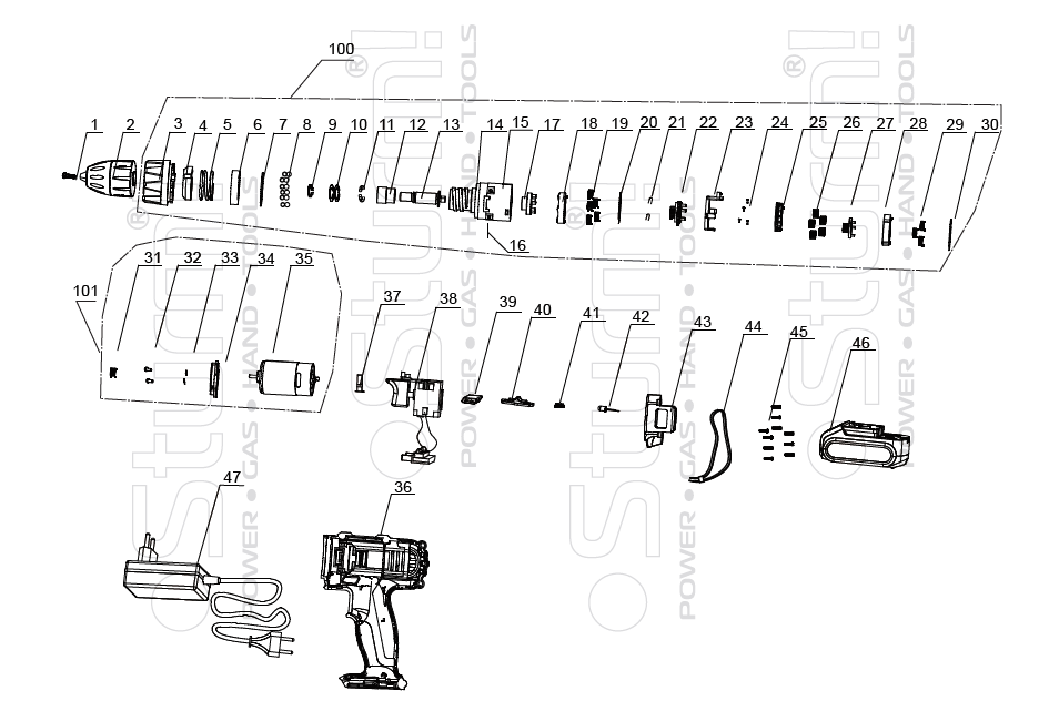Прочный двухскоростной планетарный редуктор позволяет потребителю эффективно выполнять работы по сверлению в древесине, пластмассе и металле, Оптимальная регулировка силы крутящего момента, в 21 ступень + ступень сверления, позволяет устанавливать любой крепеж без его повреждения и вдавливания в материал.