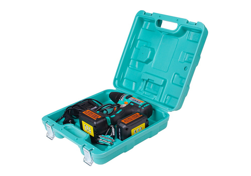 Прочный кейс, крепление для подвеса, карабин-защелка и набор бит в комплекте.