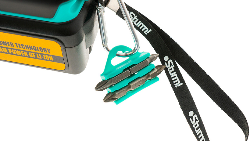 Прочный кейс, крепление для подвеса, карабин-защелка и набор бит в комплекте.