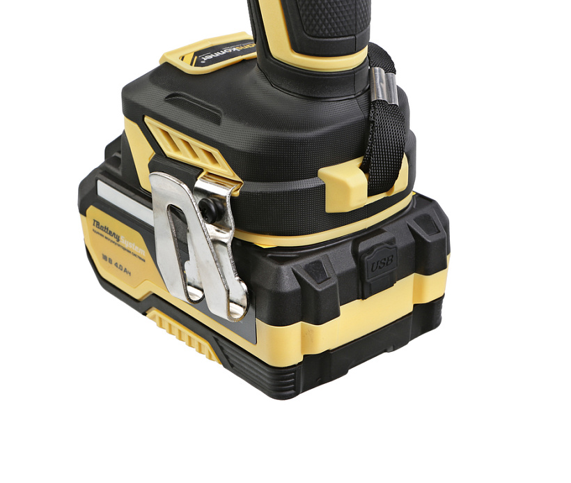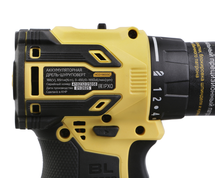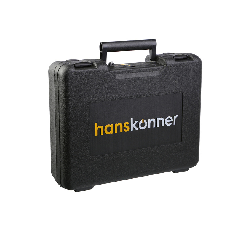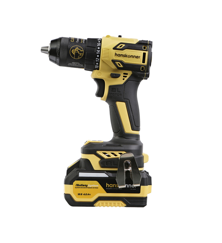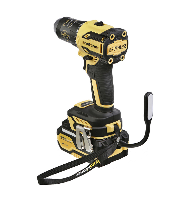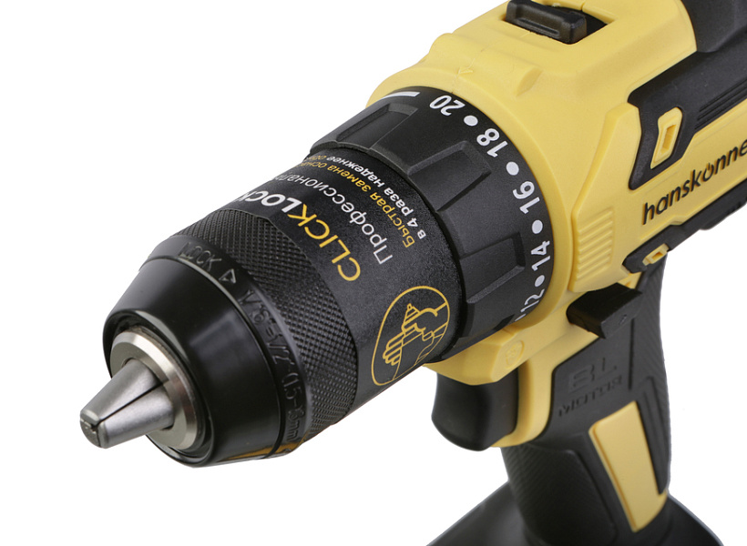 Hanskonner HCD1865SC – аккумуляторный 18 В, двухскоростной шуруповерт – является частью системы 1BatterySystem, обеспечивающей совместимость одного и того же аккумулятора с целым рядом наименований инструмента. Модель обладает максимально сбалансированной компоновкой: небольшая толщина корпуса и рукояти позволяют эффективное использование в условиях с затрудненным доступом, а нейтральный центр тяжести, и обилие прорезиненных противоскользящих поверхностей способствуют надежному хвату, и лучшему контролю в процессе работы. Шуруповерт оснащен 18 В бесщеточным двигателем, характеризующимся на 30% лучшей производительностью в сравнении с коллекторными аналогами. Кроме того, бесщеточный двигатель отлично справляется с кратковременными перегрузками и не склонен к перегреву. Благодаря применению мощного планетарного механизма High Torque Technology, обладает высоким показателем максимального крутящего момента, достигающего 65 Н м. Имеет две скорости: режим пониженных оборотов (0 – 450 об/мин) предназначен для работ с крепежом, режим повышенных оборотов (0 – 1650 об/мин) – для сверления отверстий в различных материалах. Наличие 20-ти ступенчатой муфты регулировки усилия позволяет производить максимально гибкую настройку необходимого момента затяжки. Усиленный цельнометаллический патрон c муфтой ClickLock и максимальным диаметром захвата 13 мм обеспечивает надежность фиксации, и расширяет набор применяемой оснастки для выполнения работ с повышенной нагрузкой. Предусмотрена функция блокировки вала, способствующая удобству смены оснастки одной рукой. К особенностям Hanskonner HCD1865SC стоит отнести электронный тормоз выбега двигателя, гарантирующий мгновенную остановку патрона, эффективную LED-подсветку рабочей зоны WorkingLight с блоком коллиматорных линз, создающих направленный симметричный луч, а также индикатор остаточного заряда аккумулятора PowerCheck. Дополнительному комфорту использования способствуют специальная зацепная скоба крепления на пояс и страховочный ремешок на руку.