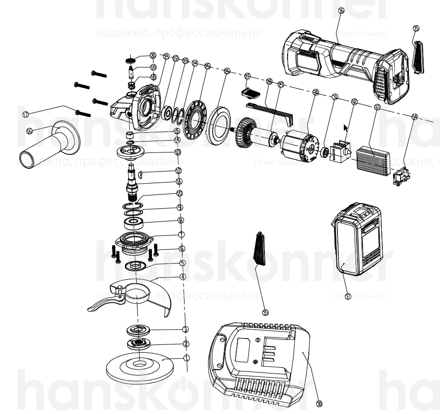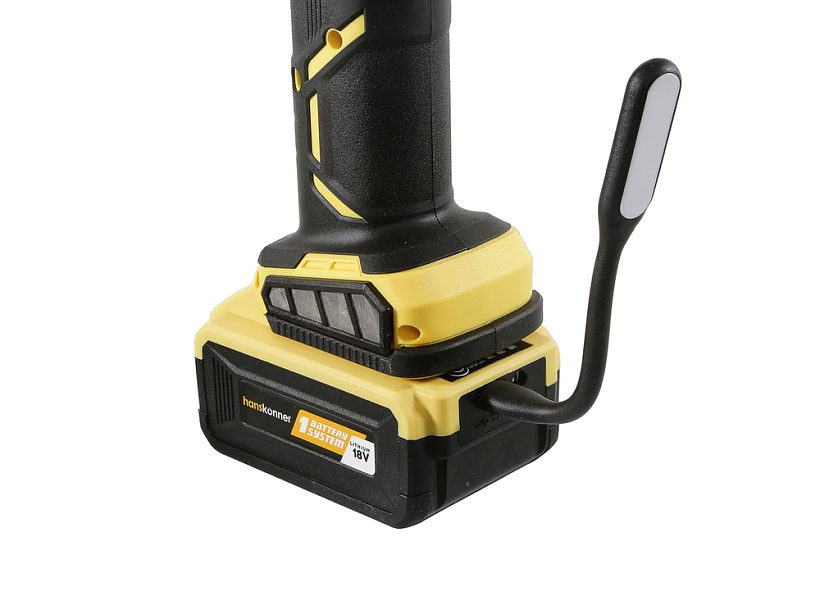 UniBattery - аккумуляторная батарея с унифицированным присоединением ко всем бесщёточным электроинструментам марки Hanskonner. Аккумулятор с индикатором заряда. Кабель зарядного устройства «velcro-belt».