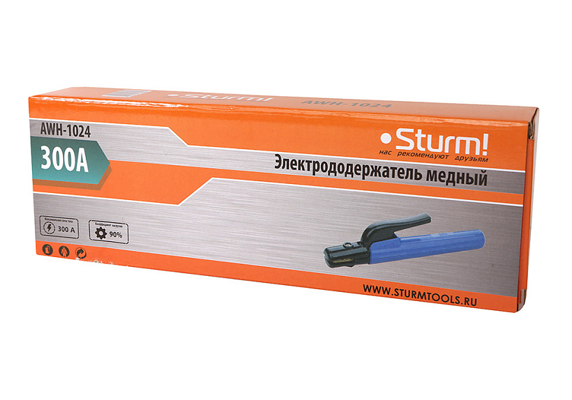 Электрододержатель 300А Sturm! AWH-1024 предназначен для фиксации электрода при ручной электродуговой сварке. Максимальный сварочный ток 300А. Тип пружинный.