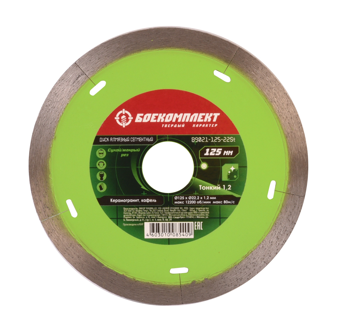 Уникальность диска заключается в ТОНКОМ 1,2 мм, чистом и ровном распиле. Высокое содержание алмазов и высота режущей кромки 10 мм увеличивают износостойкость и срок эксплуатации диска; технология самозаточки позволяет диску сохранять высокую скорость реза даже при длительной работе; тело диска из стали марки 65Mn для ровного реза, метод горячей опрессовки при производстве для наилучшей адгезии.