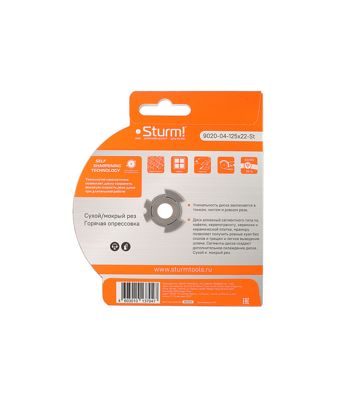 Уникальность диска заключается в ТОНКОМ, чистом и ровном распиле. Диск алмазный сегментного типа по кафелю, керамике и керамической плитке, мрамору позволяет получить ровные края без сколов и трещин и легкое выведелние шлама. Сегменты диска создают допонительное охлажение. Сухой и мокрый рез. Self-sharpening technology -Технология самозаточки позволяет диску сохранять высокую скорость реза даже при длительной работе. Тело диска из стали марки 75cri и метод горячей опрессовки при производстве алмазных дисков увеличивает его износостойкость и срок эксплуатации. Правильно подобранные компоненты металлической связки обеспечивают постепенный равномерный износ алмазного слоя.