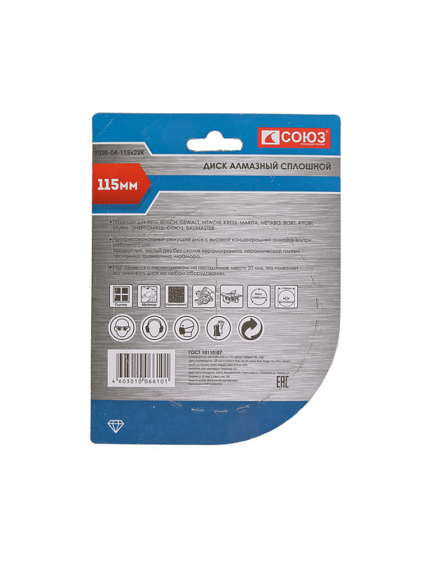 Диск алмазный СОЮЗ 9020-04-115x22К непрерывного типа для мокрой резки обеспечивает аккуратный, ровный рез без сколов керамогранита, керамической плитки, песчаника, травертина, мрамора.
