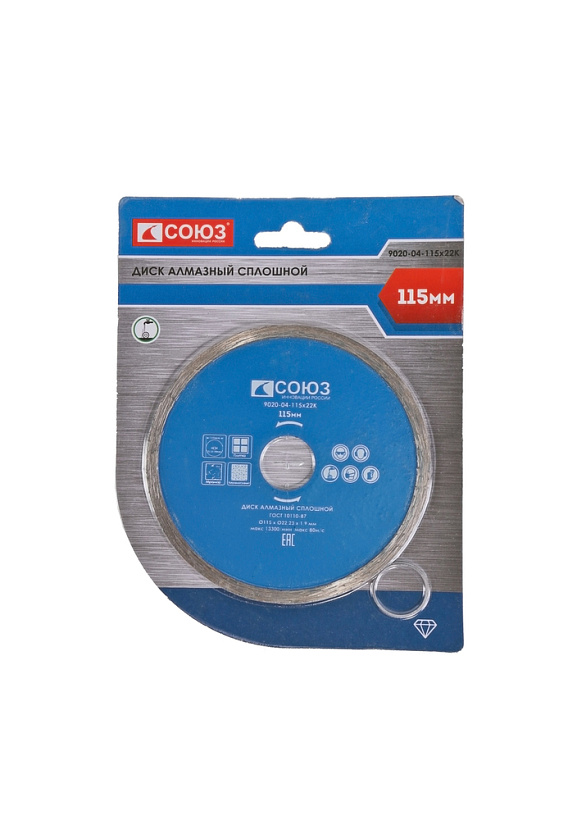 Алмазный диск со сплошным алмазным слоем, 115х22,2, Союз