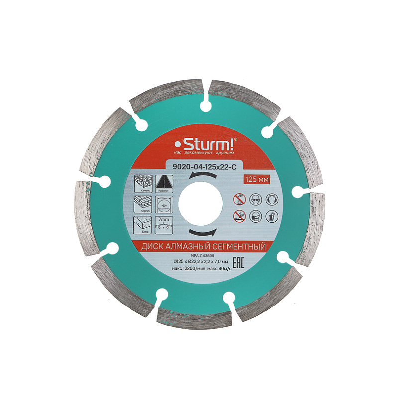 Диск алмазный Sturm! 9020-04-125x22-C сегментного типа для резки различных материалов: камня, кирпича, бетона, асфальта и тротуарной плитки. Режущая кромка с оптимальным содержанием алмазного слоя обеспечивает эффективную работу и низкую износостойкость. Промежутки между сегментами способствуют лучшему охлаждению и выбросу пыли. Тело диска, изготовленное из стали марки 65Г, обеспечивает его прочность и упругость. Переходное кольцо на 20мм в комплекте для использования с электрическим плиткорезом или иным инструментом.