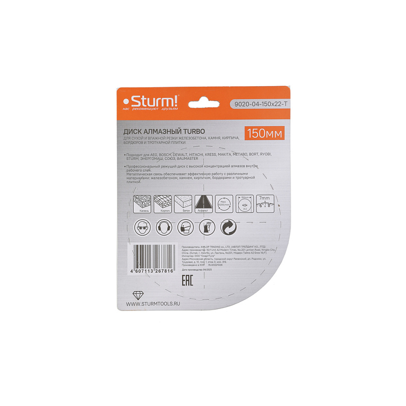 Диск алмазный Sturm! 9020-04-150x22-T с турбо сегментом для сухой и влажной резки различных материалов: камня, кирпича, бетона, железобетона, бордюра и тротуарной плитки. Режущая кромка с оптимальным содержанием алмазного слоя обеспечивает эффективную работу и низкую износостойкость. Турбо сегмент способствуют лучшему охлаждению. Тело диска, изготовленное из стали марки 65Г, обеспечивает его прочность и упругость. Переходное кольцо на 20мм в комплекте для использования с электрическим плиткорезом или иным инструментом.