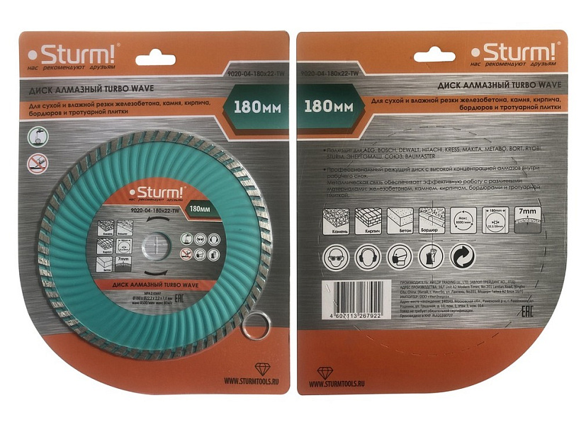 Алмазный диск, сухая/влажная резка Turbo Wave 180мм Sturm!