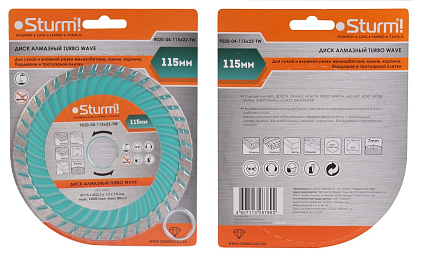 - Диск алмазный Sturm! 9020-04-115x22-TW TURBO WAVE с усиленным телом позволяет работать со сложными материалами, такие как железобетон, камень, кирпич, бордюрами и тротуарной плиткой.