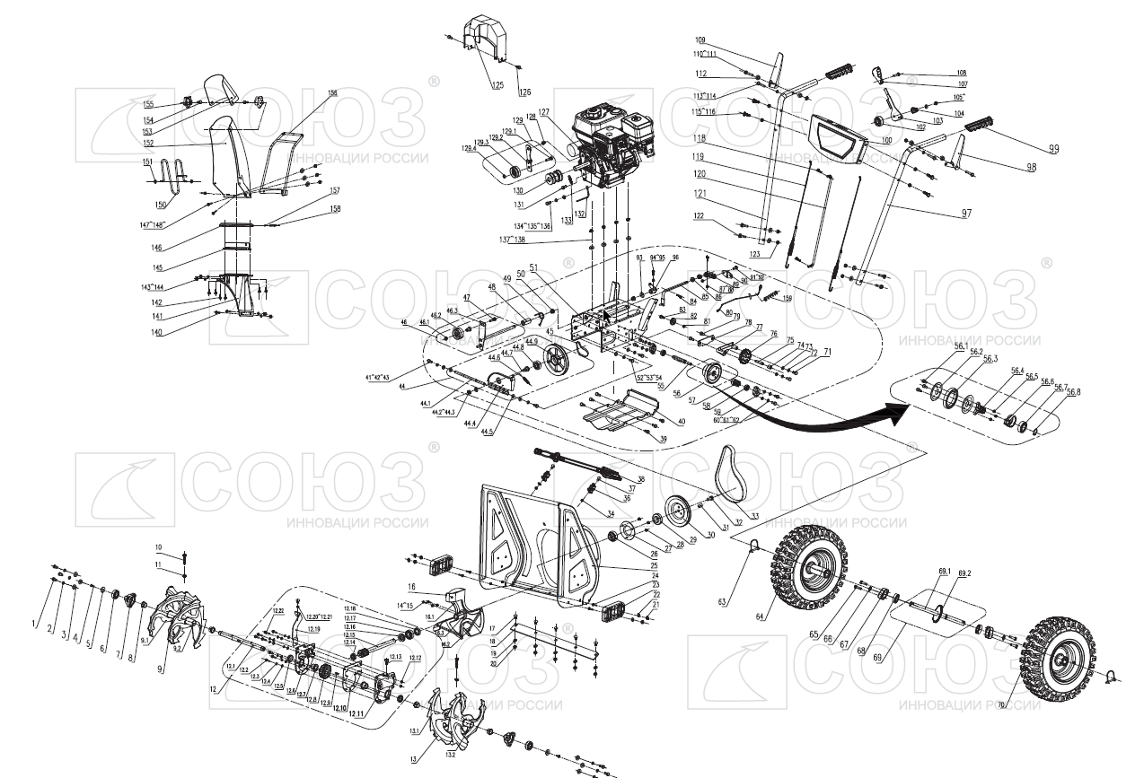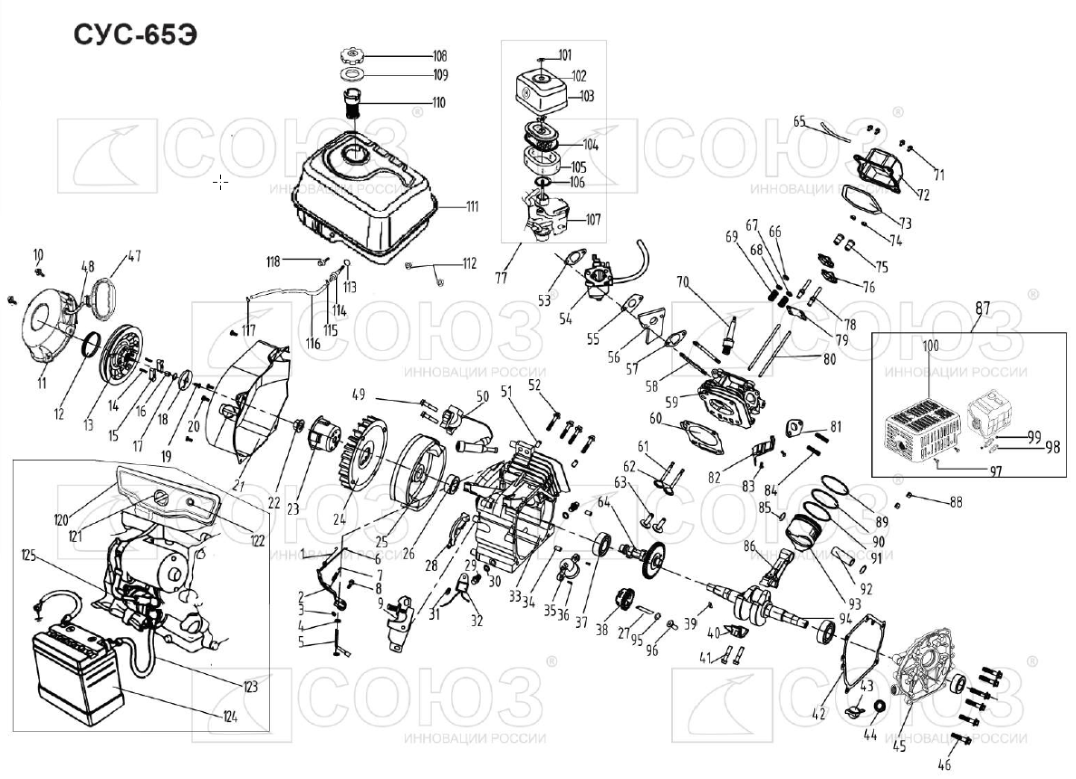Бензиновый снегоуборщик СОЮЗ СУС-65Э. Самоходная двухступенчатая снегоуборочная машина оснащена зимним вариантом надежного четырехтактного бензинового двигателя модели 168F. Система управления двигателем обеспечивает его работу в оптимальном диапазоне максимального крутящего момента, что даёт хорошую энерговооружённость для выполнения тяжёлых работ. Наличие бумажного элемента в воздушном фильтре позволяет предотвратить абразивный износ двигателя при уборке снега в загрязненных мегаполисах. "Сухая" гильза цилиндра двигателя из высокопрочного материала обеспечивает долговечность цилиндропоршневой группы.