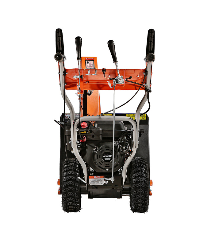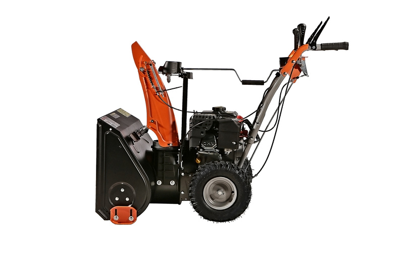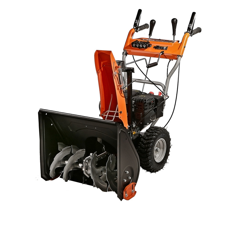 Sturm STG7461EL — универсальный самоходный бензиновый снегоуборщик. Предназначен для расчистки территорий средней и большой площади от снега различной плотности, как свежевыпавшего, так и слежавшегося. Модель оснащена надежным и неприхотливым четырехтактным двигателем KC (рабочий объем 196 см3, мощность 7 л.с.), специально адаптированным для зимней эксплуатации, а также многоступенчатой трансмиссией, значительно повышающей универсальность машины. Конструкцией предусмотрены четыре скорости движения вперед и одна назад. Низшая передача применяется при уборке плотно слежавшегося и мокрого снега, средние передачи — для работы со свежевыпавшим снегом, высшая передача — транспортный режим, предназначенный преимущественно для перемещения снегоуборщика. Важная особенность модели Sturm STG7461EL — наличие системы электрозапуска: благодаря встроенному электростартеру запуск снегоуборщика максимально удобен и прост. При необходимости, пользователь может также осуществлять запуск и с помощью ручного стартера. Высокая производительность машины обеспечивается не только мощным двигателем, но и продуманной конструкцией забора снега — этому способствует использование мощных агрессивных шнеков с большим профилем зуба, позволяющих легко справляться даже со слежавшимся снегом и настом, а также вместительного снегозагребного ковша, гарантирующего внушительную ширину прохода и возможность убирать сугробы до полуметра высотой. Снегоуборщик оснащен надежным металлическим выпускным желобом, с регулировкой по направлению выброса. Поворот желоба осуществляется дистанционно, посредством специального рычага на панели. Кроме того, предусмотрена возможность настройки угла выброса, благодаря которой регулируется необходимое расстояние выброса снежной массы. Максимальная дальность достигает 11 метров. Удобство эксплуатации в сумерках и темное время суток обеспечивает мощная LED-фара — в условиях короткого зимнего дня ее наличие является важной составляющей эффективной работы. Для лучшего сцепления с поверхностью модель комплектуется широкими пневматическими шинами с глубоким протектором.