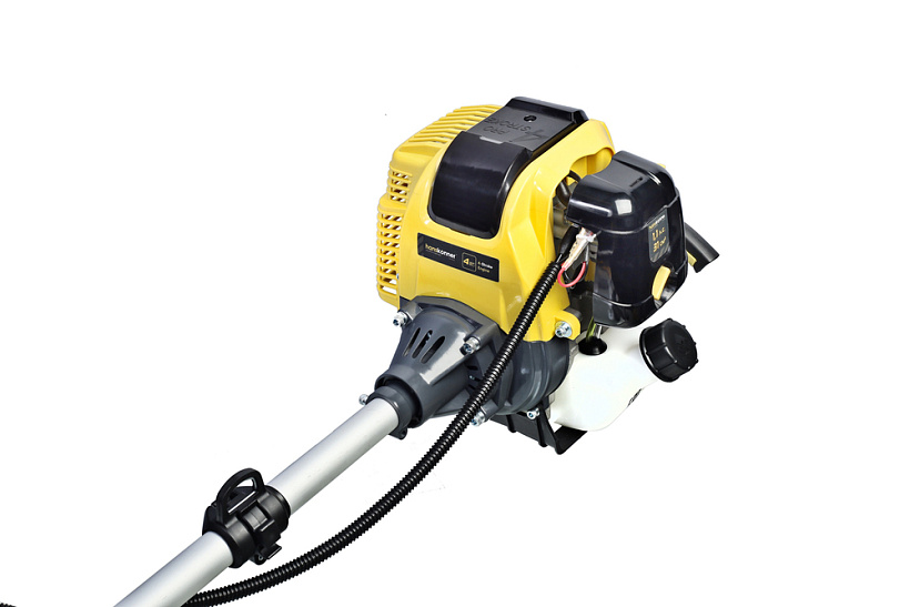 Данный триммер оснащен 4-х тактным двигателем, что упрощает его использование- экономичный расход топлива, низкий уровень шума и значительное снижение износа комплектующих, а также отсутствие необходимости приготовления бензо-масляной смеси.