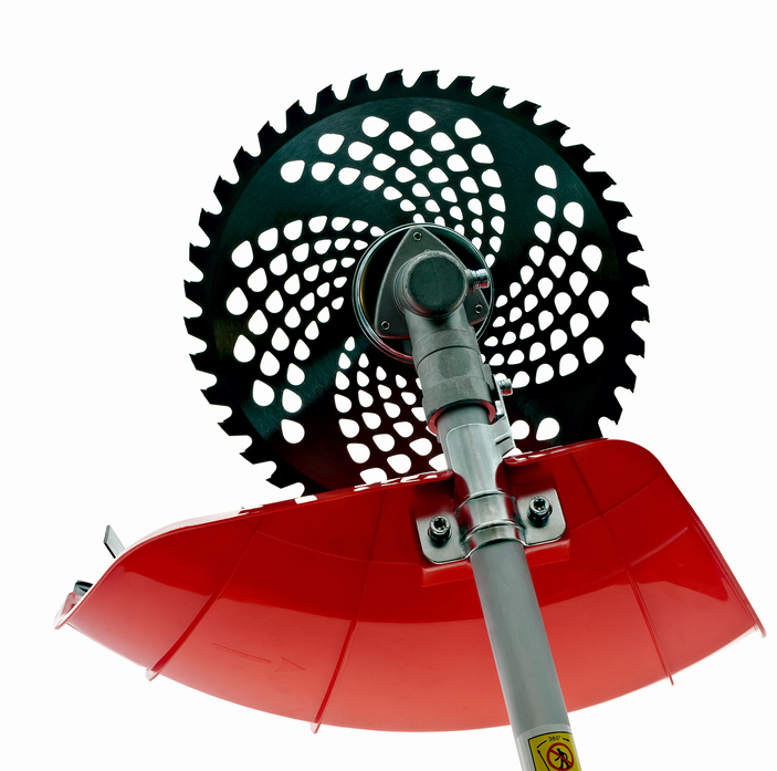 Универсальный защитный кожух можно использовать с ножом- косой для жестких зарослей, фрезой из упрочненной углеродистой стали для кустарника и тонких деревьев или кордовой головкой для травы. При этом замена лезвия производится просто и безопасно.