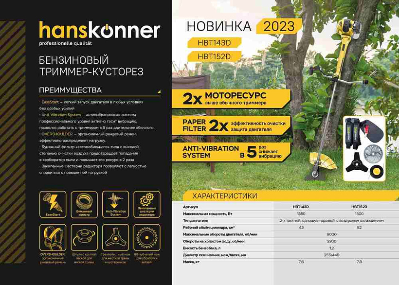 Бензиновый триммер Hanskonner – это незаменимый помощник на садовом участке, особенно на неровной поверхности или в труднодоступных местах, например, вдоль заборов, строений, вокруг кустов и деревьев. Без особых проблем он помогает справиться как с травой, так и с мелким кустарником.