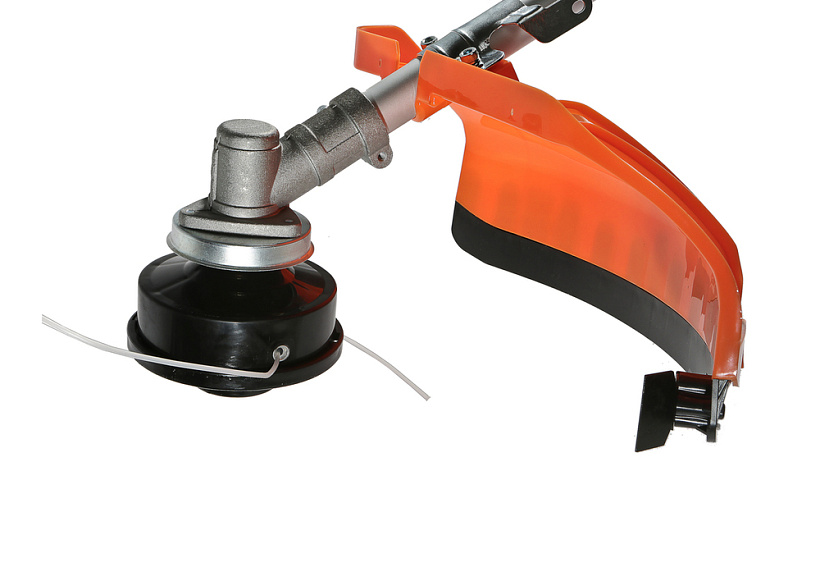 Универсальный защитный кожух можно использовать с ножом- косой для жестких зарослей или кордовой головкой для травы. При этом замена оснастки производится просто и безопасно.