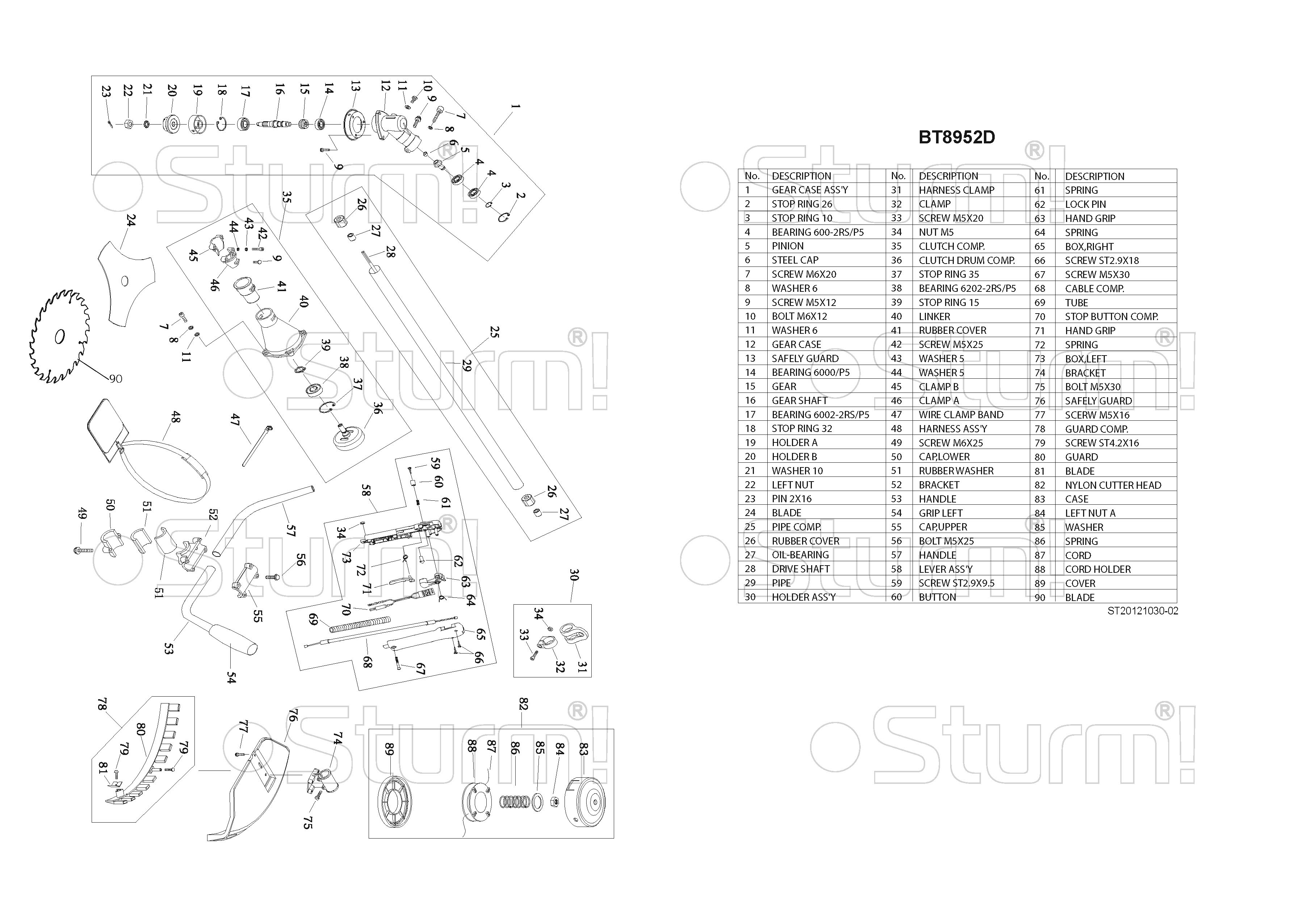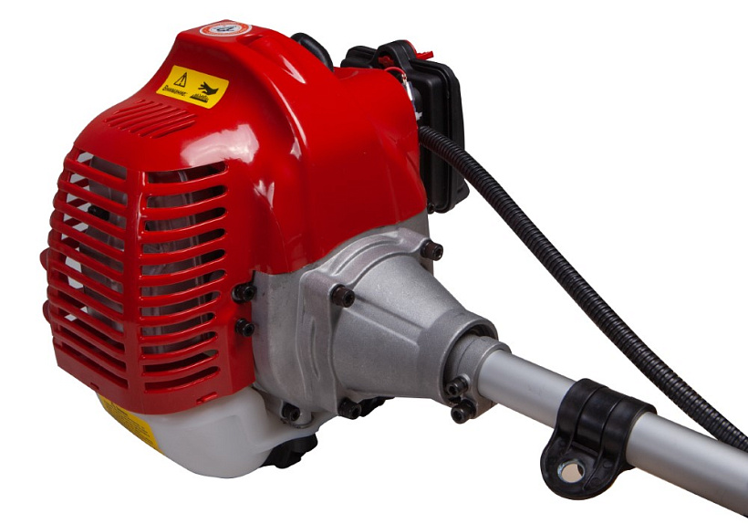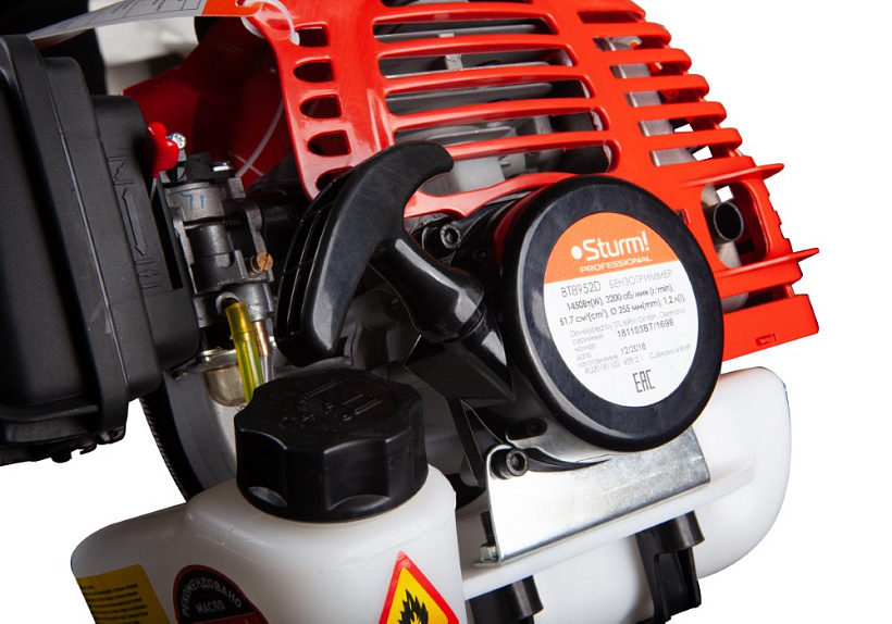 Sturm BT8952D — универсальная бензиновая коса для обработки приусадебных территорий больших площадей (более 1000 м2). Модель оснащена производительным бензиновым двухтактным двигателем рабочим объемом 52 см3, прямой неразъемной штангой с высокопрочным валом внутри, способным передавать значительный крутящий момент и мощным редуктором — все это позволяет эффективно использовать инструмент с различными типами режущей оснастки, включая не только косильные головки, но и металлические ножи и фрезы, а также культиваторные насадки. Ресурс инструмента и его безотказность гарантируют ряд конструктивных решений: двигатель Sturm BT8952D получил усиленную цилиндро-поршневую группу, коленвал повышенной прочности, а также карбюратор нового поколения, гарантирующий уверенный запуск и стабильность работы. Положительное влияние на общую надежность инструмента оказало применение фирменных высококачественных подшипников в редукторе, а также наличие направляющих антивибрационных втулок в штанге. Модель проста в обслуживании и эксплуатации. Легкость запуска обеспечивает механизм облегченного старта со специальной дополнительной пружиной, а также праймер, способствующий уверенному пуску бензокосы при различных температурных условиях, а также после длительных перерывов. Для оптимальной настройки бензокосы под конкретного пользователя конструкцией предусмотрена возможность продольной регулировки Т-образной рукояти, а также регулировка проушины крепления ремня. Инструмент имеет расширенную базовую комплектацию, куда помимо набора режущей оснастки (косильная головка, трехлопастной нож, фреза), входит ранцевый ременной подвес, позволяющий снизить нагрузку на оператора при длительной работе.