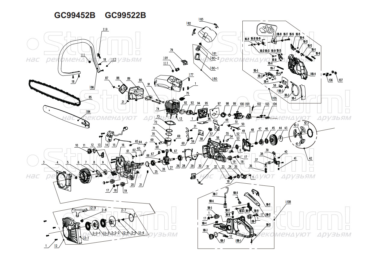 Для безопасности есть предохранительная клавиша, которая предотвращает случайное нажатие газа, ограничитель цепи, защитный щиток для правой руки и цепной тормоз – последние активируется силой инерции или в принудительном порядке. Антивибрационная система отвечает за эффективное поглощение вибрации, что немаловажно для здоровья оператора. Рукоятки с удобным расположением относительно центра тяжести делают бензопилу хорошо сбалансированной. За счет этого ею удобно управлять в любой ситуации. Благодаря быстросъемной крышке воздушного фильтра упрощается уход за ним, в частности, чистка и замена свечи и воздушного фильтра.