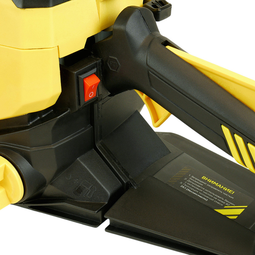 Безопасность работы обеспечивается предохранительной клавишей, предотвращающей случайное нажатие газа, ограничителем цепи, защитным щитком для правой руки, а также цепным тормозом, активируемым принудительно либо силой инерции. Два способа активации тормоза цепи повышают безопасность труда.