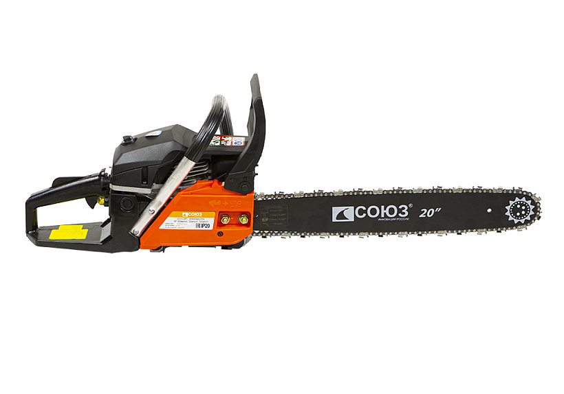 Бензопила СОЮЗ ПТС-9952. "Старшая" модель в данной линейке бензопил. Поставляется с шиной 50 см и двигателем объемом 52 см3. Имеет имеет прочную конструкцию и предоставляет оптимальную мощность для эффективной работы.
