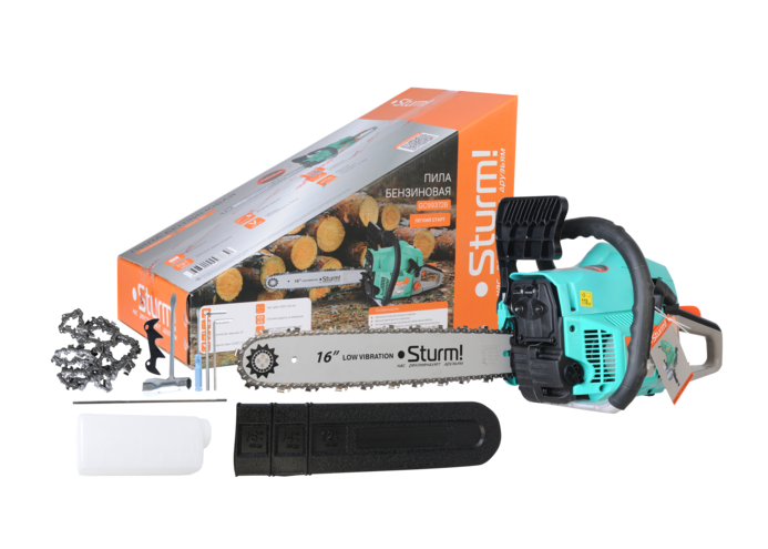 Sturm GC99372B — универсальная бензиновая пила бытового назначения. Уверенно справляется с работами по распилу древесины различной сложности и объема: от подрезания веток на садовом участке и вплоть до сезонной заготовки дров. Инструмент обладает оптимальными массово-габаритными показателями и нейтральным центром тяжести, что положительно влияет на маневренность и способствует лучшему контролю пилы в процессе использования. Модель оснащена производительным и экономичным двухтактным двигателем рабочим объемом 45 куб см и мощностью 1.9 кВт, а также пильной гарнитурой наиболее популярной размерности — 405 мм. Надежность и безотказность работы обеспечивает ряд конструктивных решений: хромоникелевое покрытие стенок цилиндра снижает вероятность повреждения его стенок при недостаточной смазке или перегреве, кованый коленчатый вал имеет высокую прочность и хорошо противостоит интенсивным нагрузкам, карбюратор нового поколения гарантирует стабильность работы двигателя при низких температурах. Снижению уровня вибрации способствует применение многоточечной антивибрационной системы. Модель проста в эксплуатации и не вызовет затруднений у пользователей, не обладающих достаточными навыками работы с бензопилами. Важной особенностью является боковое расположение механизма натяжения цепи, за счет чего существенно упрощается ее регулировка и исключается риск повреждения рук пользователя от случайного контакта с зубьями цепи. Благодаря системе облегченного старта со специальной дополнительной пружиной запуск бензопилы производится с меньшим усилием, а наличие праймера обеспечивает уверенный пуск инструмента после длительных перерывов в использовании. Возможность безынструментального доступа к карбюратору, фильтрующему элементу и свече зажигания обеспечивает удобство обслуживания пилы даже в самых неприспособленных условиях.