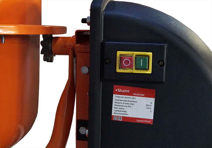 Sturm CM20070RF – мощный и производительный бетоносмеситель – предназначен для быстрого приготовления строительных смесей в больших объемах. Имеет классическую компоновку – в основе конструкции усиленная прочная рама, стойкая к возможным ударам и повреждениям в ходе эксплуатации. Модель оснащена надежным асинхронным двигателем, обеспечивающим возможность непрерывной работы до 45 минут, высококачественным механизмом привода, изготовленным из серого чугуна, отличающимся высокой механической прочностью и не требующим дополнительной смазки, а также емким стальным барабаном с 1.5 мм толщиной стенок – все это положительно влияет на долгий срок службы и износостойкость. Мощность двигателя в 500 Вт позволяет с легкостью проворачивать барабан, как при его частичной загрузке, так и при полной. Защиту от перегрева в процессе работы обеспечивает предусмотренное конструкцией термореле. Специальный пластиковый кожух страхует от попадания в двигатель и электрочасть строительной пыли и влаги. Благодаря ножному механизму фиксации положения барабана достигается удобство при выгрузке смеси. Для легкости перемещения с места на место модель комплектуется прочными транспортировочными колесами.