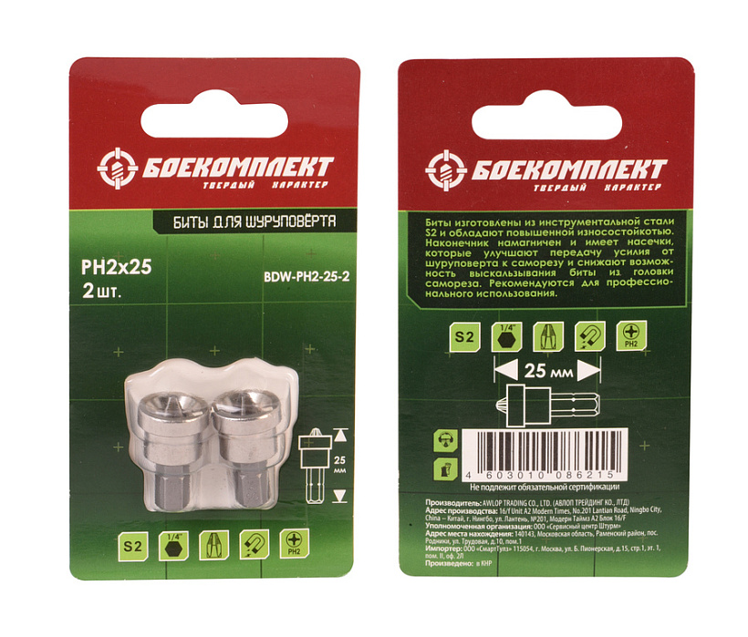 Биты по гипсокартону PH2x25мм, сталь S2, 2шт, БОЕКОМПЛЕКТ