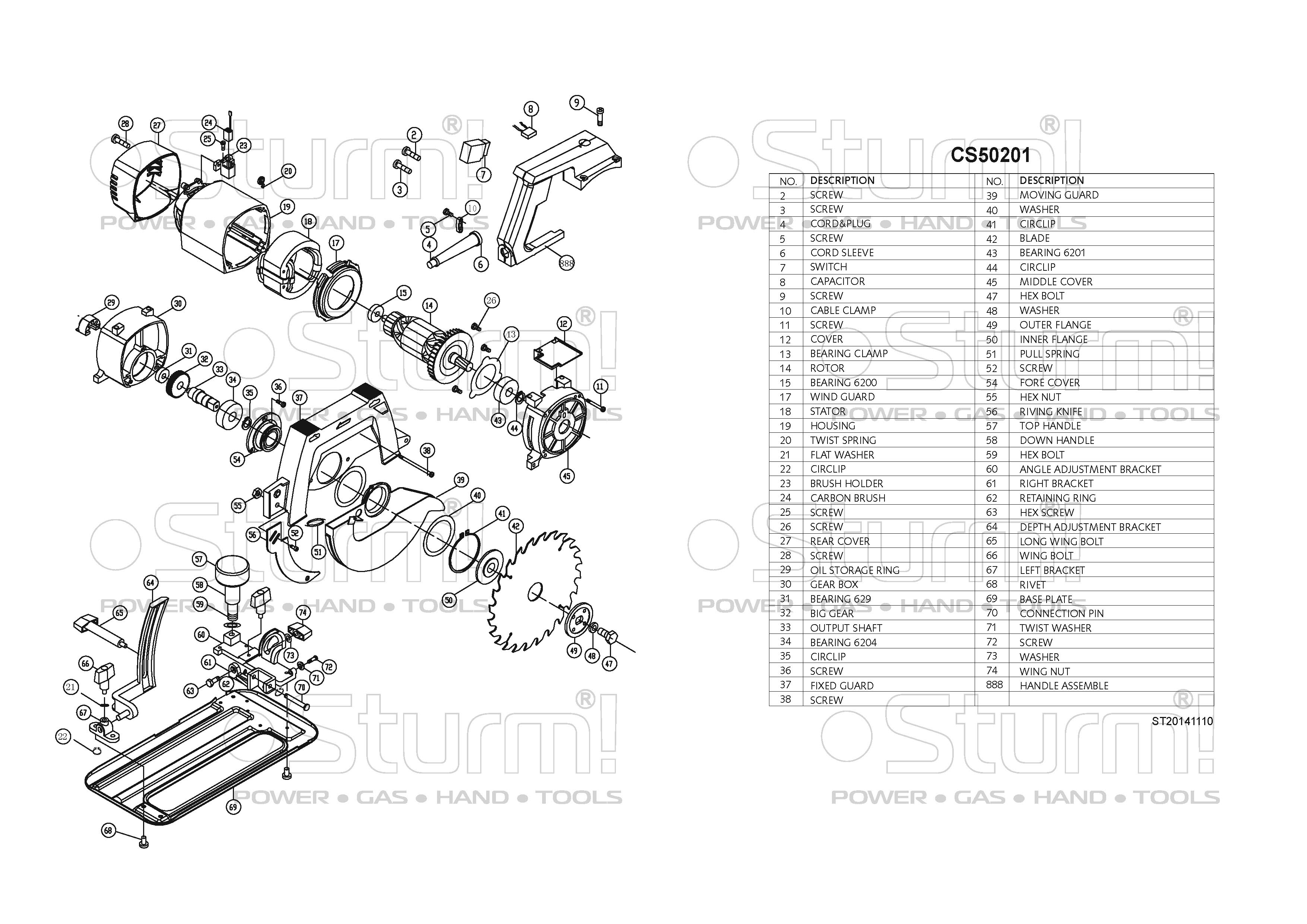 Sturm CS50201 – многофункциональная циркулярная пила с возможностью стационарной установки. Модель оснащена производительным 2000 Вт двигателем, развивающим скорость вращения 5500 об/мин и уверенно справляется с пропилами глубиной до 65 мм. Для предотвращения заклинивания режущего диска во время работы конструкцией предусмотрен специальный расклинивающий нож. Благодаря регулируемой опорной платформе, пользователь может при необходимости настроить оптимальную глубину пропила. Кроме того, опорная платформа имеет возможность регулировки и бесключевой фиксации в наклонном положении на угол до 45 градусов. Для максимально точной установки опорной платформы под требуемым углом предусмотрена специальная шкала с насечкой. Важным достоинством модели Sturm CS50201 является возможность стационарного крепления к рабочему столу диском вверх – инструмент можно использовать как распиловочный станок. Удобство смены оснастки обеспечивает функция блокировки вала шпинделя – с ее помощью замена пильного диска происходит быстро и легко без необходимости применения вспомогательного, стопорящего вал ключа. Наличие системы отвода пыли позволяет эффективно удалять опилки и пыль из зоны резания. Безопасность при работе гарантируют автоматически сдвигающийся в процессе работы защитный кожух, прикрывающий вращающий пильный диск, а также блокиратор кнопки пуска, предотвращающий случайный запуск пилы.