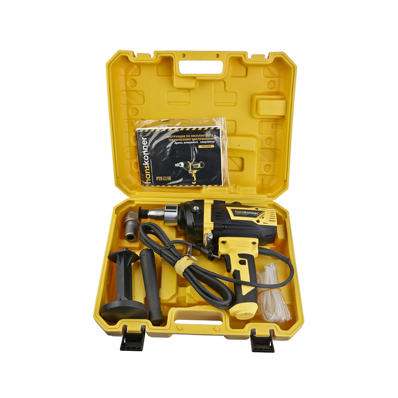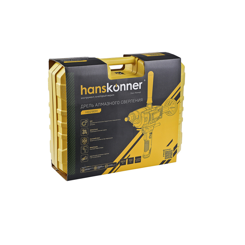 Дрель алмазного сверления Hanskonner HID2180M — компактный и мощный электроинструмент с надежной конструкцией для сверления алмазными коронками отверстий в таких материалах: бетон, железобетон, искусственный и натуральный камень, кирпич. Подключив инструмент к водопроводному крану можно сократить запыленность рабочей зоны, а также износ алмазных коронок и дрели. Данная модель оснащена предохранительной муфтой, срабатывающей при заклинивании коронки, и термозащитой работающей при других видах перегруженности.