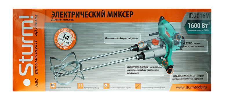 Sturm ID2016M – мощная двухшнековая двухскоростная дрель-миксер. Предназначена для быстрого и качественного перемешивания растворов и смесей любого типа. Имеет оптимальные габаритные размеры и сбалансирована по массе, за счет чего хорошо контролируется и удобна при продолжительных работах. Надежности хвата в процессе использования способствуют прорезиненные накладки на рукоятях. Инструмент оснащен 1600 Вт электродвигателем со специальным термостойким покрытием, усиленным редуктором с закаленными шестернями, высококачественными шарикоподшипниками и обеспечивает стабильное перемешивание даже густых и вязких материалов. Лучшему отводу тепла от механической части способствует корпус редуктора, выполненный из литого алюминия. Особенностью модели Sturm ID2016M является наличие двухскоростного редуктора – в зависимости от поставленной задачи пользователь с помощью специального переключателя может выбирать между пониженным режимом работы (0–600 об/ мин) с большим крутящим моментом и повышенным (0 800 об/ мин). скоростным режимом Предусмотрена электронная регулировка количества оборотов, позволяющая настраивать частоту вращения прямо в процессе работы. Для удобства обслуживания инструмент имеет функцию быстрого доступа к щеткам, гарантирующую возможность их замены, без демонтажа элементов корпуса.
