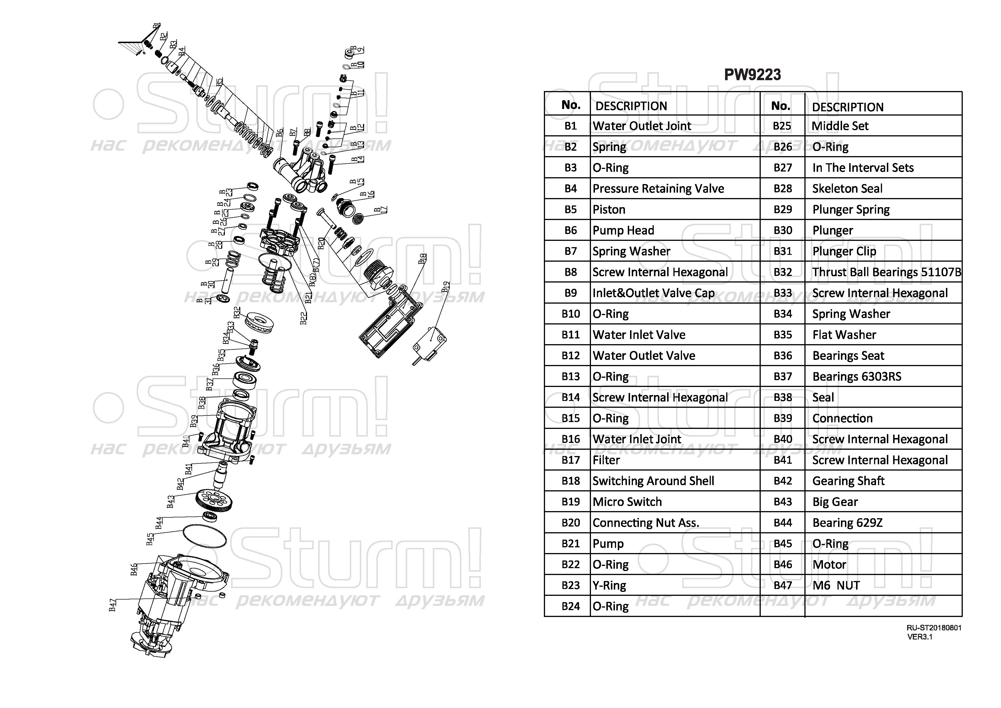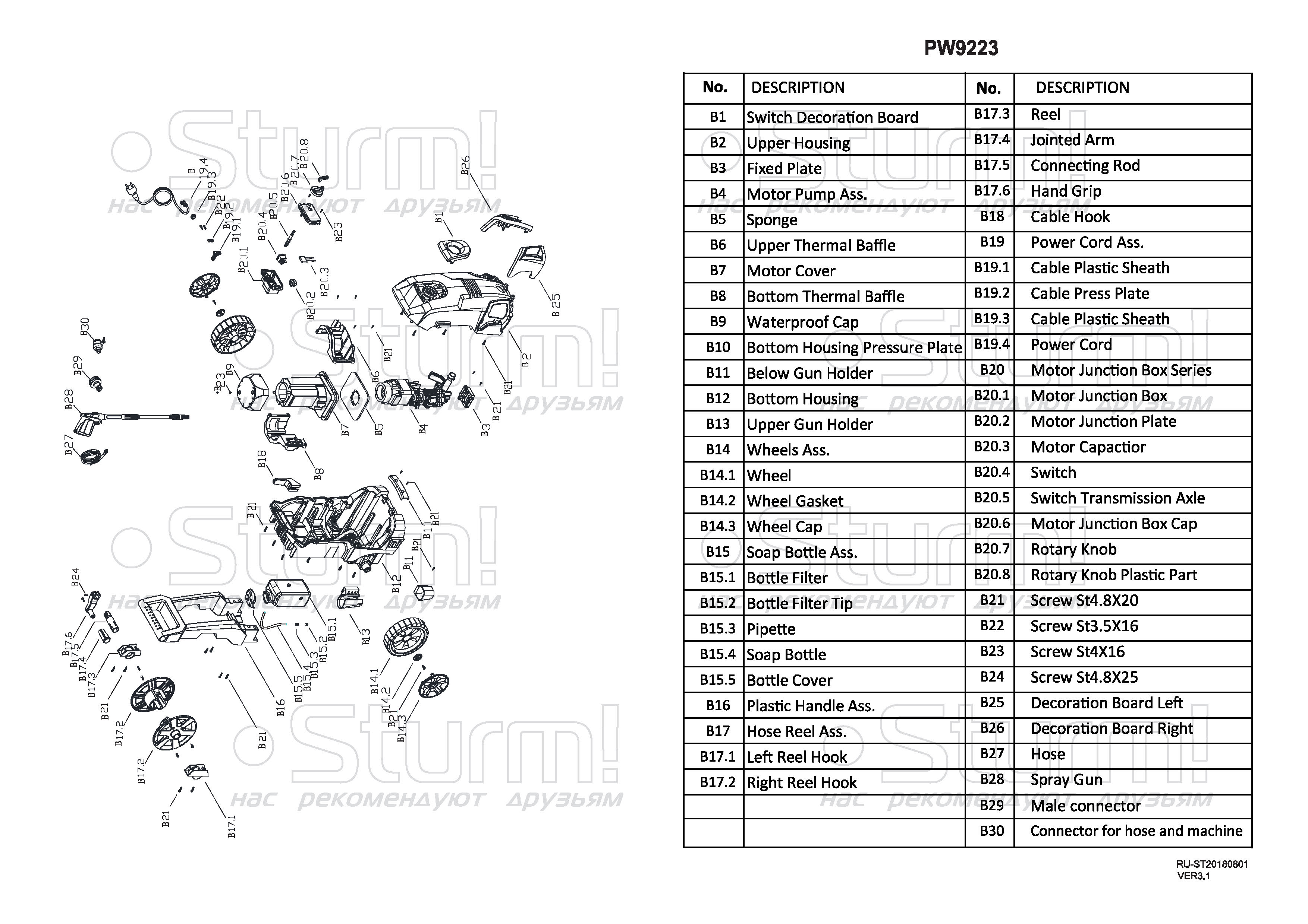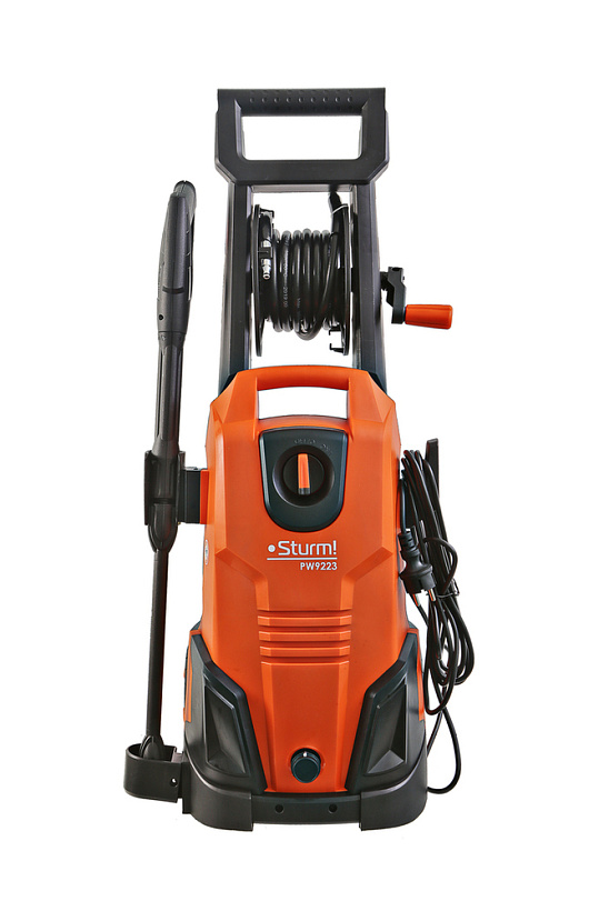Sturm PW9223 – универсальная мойка высокого давления для бытового использования. Представляет оптимальное сочетание производительности, выверенной эргономики, и широкого функционала. Модель оснащена мощным 2300 Вт электромотором и трёхплунжерной алюминиевой помпой, обеспечивающей производительность в 450 л/час, и высокие показатели по выходному давлению (максимальное давление – 165 бар / рабочее давление – 110 бар) – все это способствует быстрому и эффективному удалению даже самых стойких загрязнений. Входной и выходной патрубки помпы также изготовлены из алюминия, что повышает механическую прочность изделия. Важная особенность мойки Sturm PW9223 – наличие функции самовсасывания, позволяющей полноценную эксплуатацию устройства даже при отсутствии условий для подключения к стационарному водопроводу, используя для забора открытые источники: ведро, бочку или бак. Модель комплектуется длинным семиметровым шлангом высокого давления, обеспечивающим значительную рабочую площадь: с его помощью можно свободно мыть легковой автомобиль, очищать крыши дачных построек и другие объекты без необходимости передвигать мойку с места на место. Для защиты шланга от нежелательных перегибов предусмотрена штатная катушка для его намотки. Легкости подключения шланга и оснастки способствуют специальные быстросъемные соединения QuickConnect. . Безопасную, энергосберегающую и долговечную работу мойки гарантируют встроенная термозащита и автоматическая система с микровыключателем мгновенной остановки двигателя Total Stop. Удобство перемещения достигается благодаря большим транспортировочным колесам.