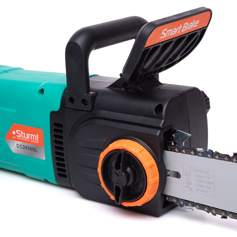 Sturm CC2616SL – производительная электрическая цепная пила бытового класса. Инструмент имеет продольную компоновку двигателя и благодаря этому, отлично приспособлен к использованию в условиях с затрудненным доступом. Модель оснащена электромотором мощностью 2.6 кВт и развивает скорость движения цепи в 720 м / мин – это способствует как высокой скорости единичного пропила, так и общей производительности при значительных объемах работы. Для обеспечения высокого ресурса, особое внимание уделено наиболее нагруженным элементам конструкции: электромотор покрыт несколькими изоляционными слоями термостойкого лака, вал приводной звездочки установлен на шарикоподшипниках, шестерни редуктора выполнены из высоколегированной стали. Кроме того, применение шестерен с конической формой зуба позволило снизить уровень шума при работе. Для комфорта пользователя, модель Sturm CC2616SL получила бесключевую систему натяжения цепи, позволяющую производить регулировку натяжения цепи без применения вспомогательного инструмента. Безопасность использования гарантируют тормоз экстренной блокировки цепи Smart Brake, мгновенно останавливающий цепь при срабатывании тормозного щитка или при отпускании клавиши пуска, а также защита от непреднамеренного запуска. Удобству обслуживания способствует функция быстрого доступа к щеткам, позволяющая производить их замену без демонтажа элементов корпуса.