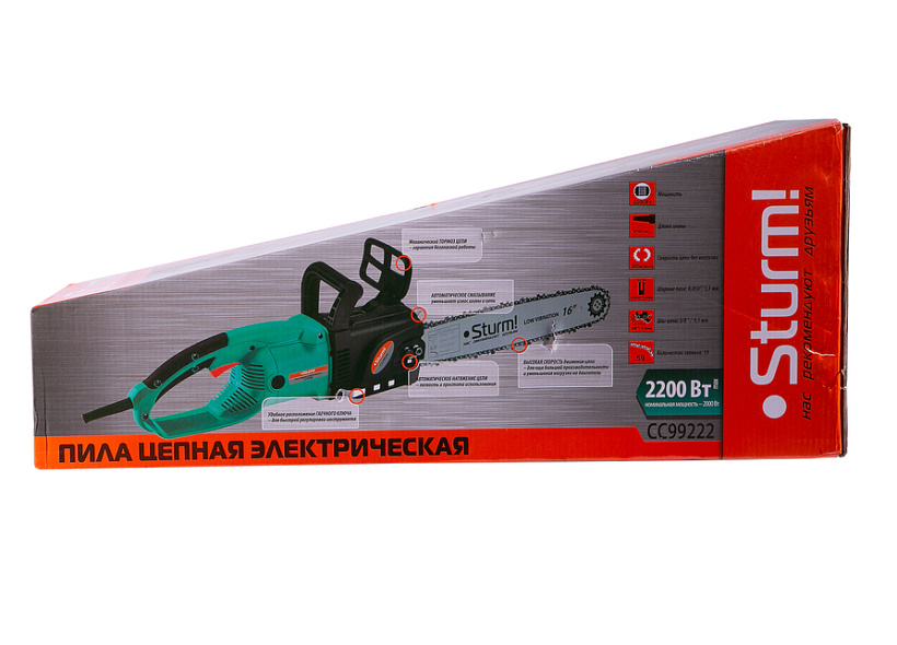 Надежный электромотор — многослойное покрытие термостойким лаком обмоток ротора надежно защищают от межвиткового замыкания, двухстороннее бронирование ротора армирующей нитью — от абразивного воздействия мелкодисперсной пыли. • Металлические шестерни редуктора — шестерни редукторного механизма выполнены из качественной легированной стали и гарантируют надежность и долговечность использования. • Вал приводной звездочки на шарикоподшипниках — обеспечивает стойкость к нагрузкам, гарантирует надежность и повышенный ресурс работы. • Автоматический механизм натяжения цепи — обеспечивает оптимальное натяжение цепи. • Автоматическая система подачи масла — приостанавливает смазку при работе на холостом режиме и позволяет настраивать подачу масла в соответствии с технологическими потребностями. • Функция быстрого доступа к щеткам — возможность быстрой замены щеток, исключающая необходимость демонтажа элементов корпуса пилы. Гарантийные обязательства: на электроинструмент Sturm действует расши
