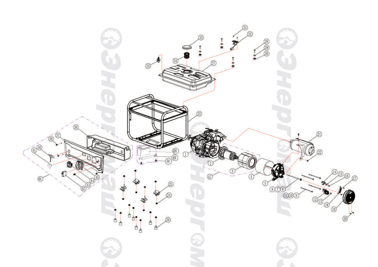 Прочный рамный каркас из закаленной стальной трубы защищает двигатель и топливный бак.