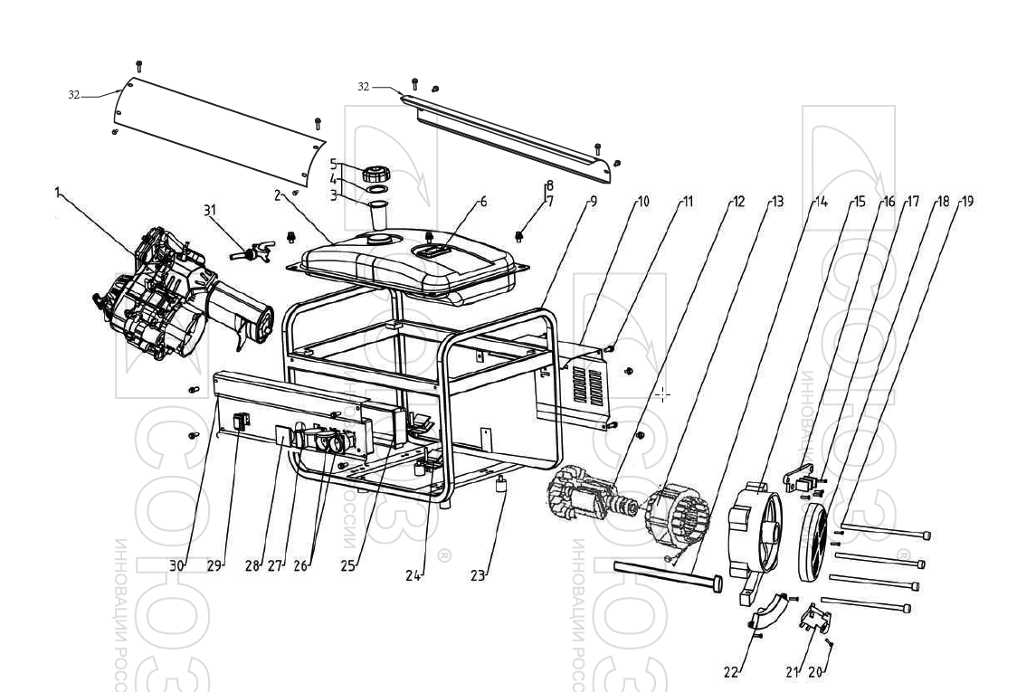Прочный рамный каркас из закаленных труб защищает рабочие органы аппарата от механических воздействий и обеспечивают удобство перемещения и простоту установки. Система поддержания энергобезопасности автоматически отключает потребителей от генератора при возникновении короткого замыкания или перегрузки.
