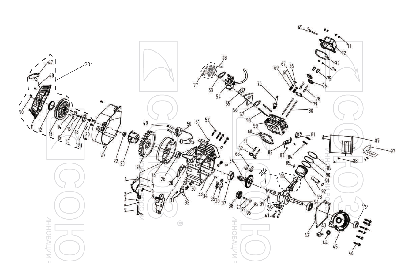 Двигатель прекрасно сбалансирован, стабильно работает во всех положениях без потери мощности и имеет низкий расхода топлива. Долговечность цилиндропоршневой группы обеспечивается за счет установки в цилиндр гильз из специального чугуна с последующей алмазной хонинговкой.