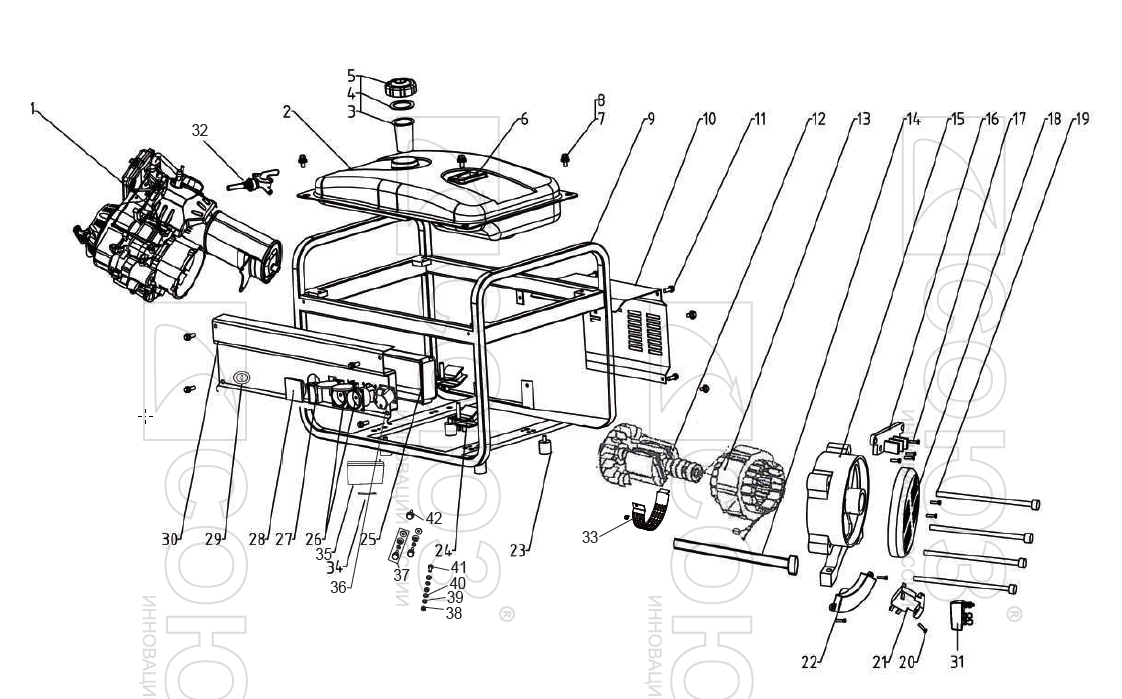 Прочный рамный каркас из закаленных труб защищает рабочие органы аппарата от механических воздействий и обеспечивают удобство перемещения и простоту установки. Система поддержания энергобезопасности автоматически отключает потребителей от генератора при возникновении короткого замыкания или перегрузки.