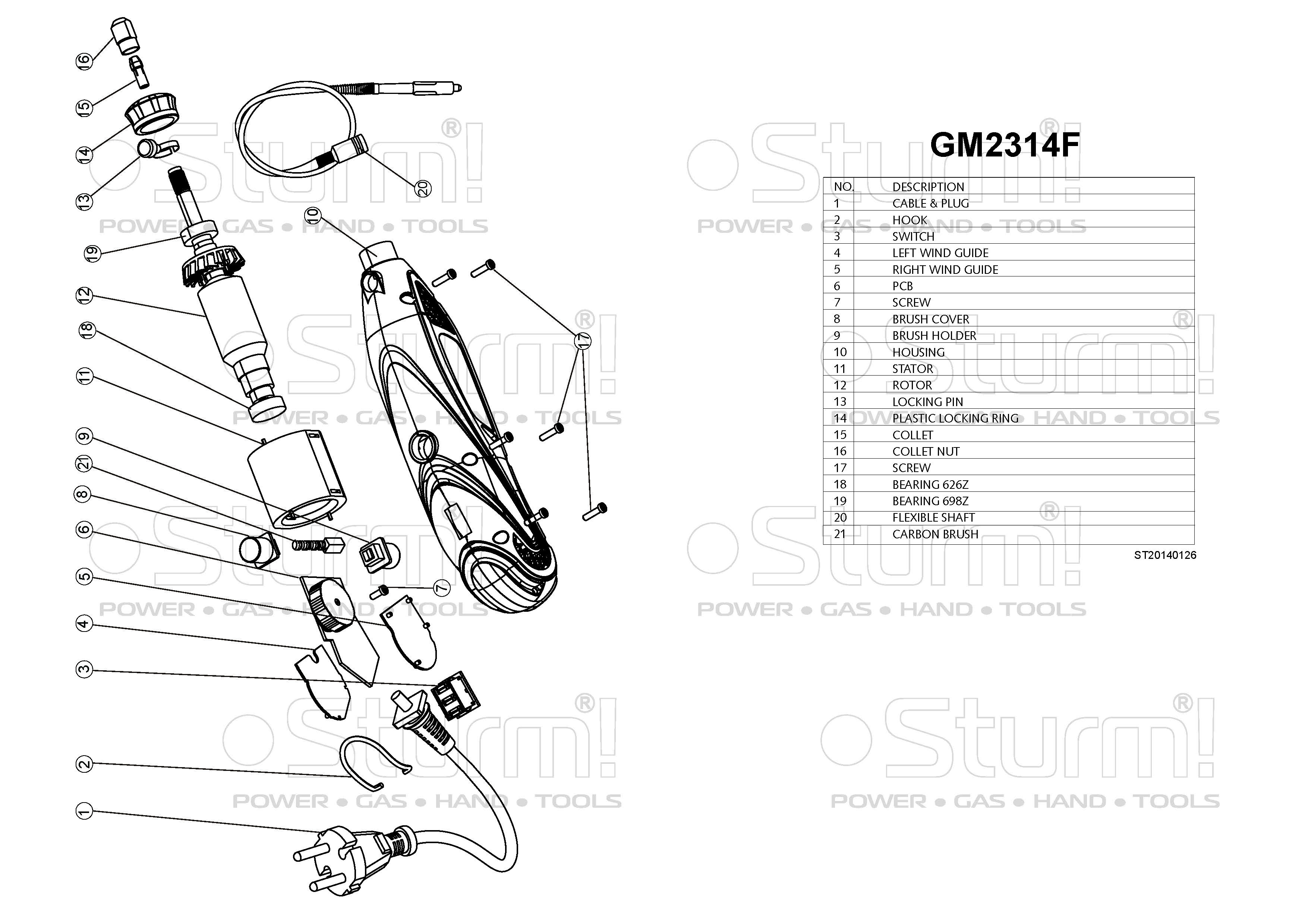 Sturm GM2314F - универсальный электрический гравер. Предназначен для выполнения различных мелких и точных работ: гравировки, шлифовки, полировки, сверления и резки. Инструмент имеет небольшие массогабаритные показатели, а также отличную эргономику ¬– все это способствует лучшему контролю рабочего процесса и надежности хвата. Благодаря гибкому валу значительно упрощается проведение работ в стесненных условиях и труднодоступных местах, а наличие на корпусе металлической скобы дает возможность подвесить гравер в любом удобном месте, тем самым, повышая комфорт использования. Модель оснащена функцией регулировки оборотов в широком диапазоне от 10000 до 32000 об / мин и позволяет выбрать оптимальный технологический режим для конкретного вида материала и оснастки. Система крепления насадок с использованием двух типовых диаметров (2.4 и 3.2 мм) фиксирующей цанги облегчает подбор оснастки и значительно расширяет диапазон применения устройства. Для легкой и удобной замены оснастки предусмотрена возможность блокировки вала шпинделя. Наличие функции быстрого доступа к щеткам позволяет проводить их замену без необходимости разборки корпуса инструмента. В комплекте с инструментом поставляется расширенный набор оснастки из 40 аксессуаров, а также гибкий вал и прочный пластиковый кейс.