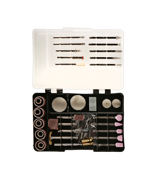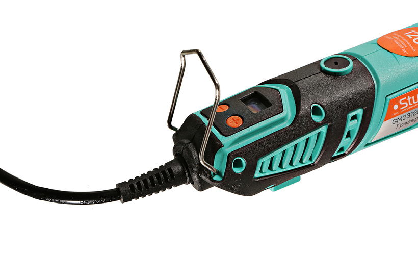 Хорошая эргономика корпуса с противоскользящими накладками дополняется наличием вспомогательной рукоятки для хвата при выполнении деликатных работ и стойки для подвешивания гравера с помощью складной скобы при работе с использованием гибкого вала.