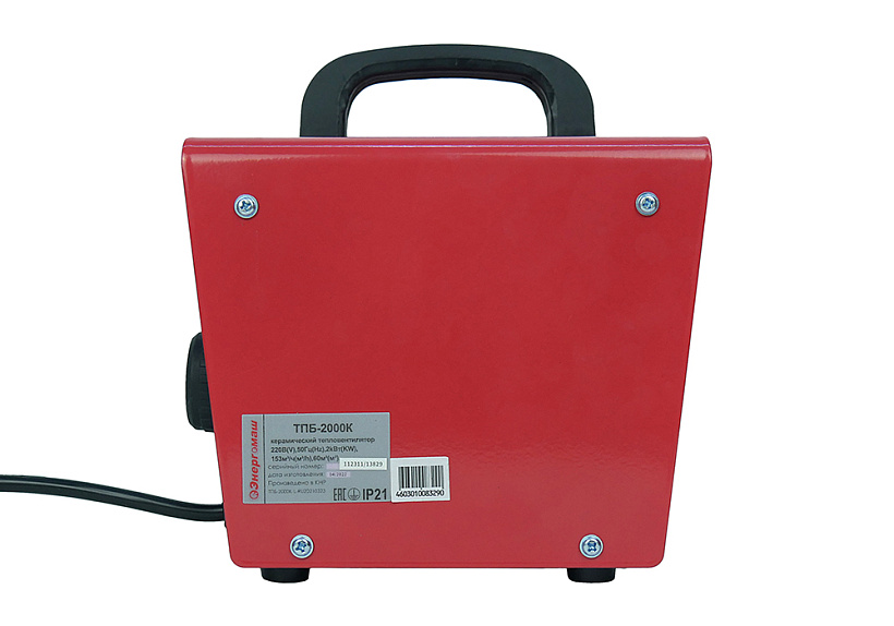Энергомаш ТПБ-2000К – мобильный керамический обогреватель мощностью 2 кВт и производительностью воздушного потока 153 м3 / ч. Предназначен для временного или постоянного обогрева жилых, производственных и вспомогательных помещений площадью до 30 м2. Благодаря своей прямоугольной форме и низкому центру тяжести, обогреватель очень устойчив, что минимизирует риск его случайного опрокидывания. Модель оснащена металлокерамическим нагревательным элементом, за счет большой теплоотдающей поверхности которого гарантируется быстрый прогрев помещения. Обогреватель не сушит воздух и не выделяет вредных веществ. Для того, чтобы обеспечить высокую производительность воздушного потока, проходящего через нагревательный элемент и ускорить циркуляцию нагретого воздуха в помещении, прибор имеет встроенный вентилятор. Управление устройством осуществляется двухпозиционным кнопочным выключателем, расположенным на задней панели. С его помощью, пользователь может выбрать оптимальный режим работы: 1 кВт – (теплый обдув), либо 2 кВт – (горячий обдув). Также, Энергомаш ТПБ-2000К оснащен термостатом, с возможностью регулировки, позволяющим поддерживать постоянную температуру воздуха в помещении. Удобству перемещения устройства с места на место способствует пластиковая рукоять в верхней части корпуса.