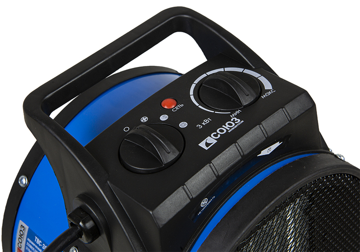 СОЮЗ ТВС-3023МК — мощный мобильный керамический обогреватель для временного или постоянного обогрева жилых, производственных и вспомогательных помещений площадью до 40 м2. Главная особенность модели — наличие в конструкции металлокерамического нагревательного элемента, благодаря большой площади теплоотдающей поверхности которого гарантируется быстрый нагрев. Для того, чтобы обеспечить высокую производительность воздушного потока, проходящего через нагревательный элемент и ускорить циркуляцию нагретого воздуха в помещении, обогреватель оснащен встроенным мощным вентилятором. Управление устройством осуществляется парой регуляторов, расположенных на верхней панели. С помощью первого регулятора пользователь выбирает один из трех режимов работы: вентиляция без нагрева / теплый обдув / горячий обдув. Второй регулятор — управление настройкой термостата, задача которого — поддержание постоянной температуры в помещении. Визуальному контролю включенного устройства способствует отдельный индикатор питания, размещенный на панели управления. Дополнительное удобство при использовании обеспечивает возможность регулировки направления воздушного потока посредством наклона корпуса обогревателя вверх-вниз, а также широкая опорная подошва по периметру, предотвращающая случайное опрокидывание устройства.