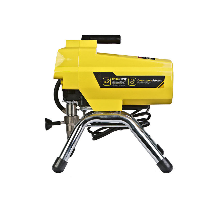 Дополнительный фильтр для очистки краски исключает частое засорение сопла. Надежный поршневой насос EndurPump в среднем служить в два раза дольше чем бытовые аналоги. Для долговечности электродвигателя применяется защита от перегрузки.