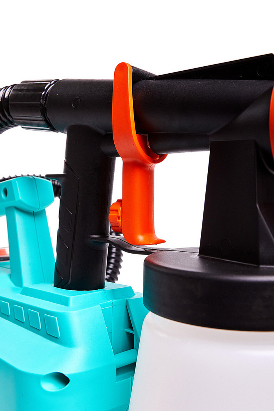 Sturm SG9660B – универсальный электрический краскораспылитель с выносной базой. Модель проста в эксплуатации и не вызовет затруднений у пользователей, не обладающих достаточными навыками работы с краскораспылителями. Главная особенность Sturm SG9660B в его компоновке: силовой блок, куда входят электромотор и нагнетающая турбина, и распылительный пистолет конструктивно разделены между собой и представляют отдельные элементы, взаимосвязь между которыми осуществляется лишь за счет двухметрового гофрированного шланга для подачи воздуха. Такая конструкция имеет существенные достоинства: лучший контроль распылительного пистолета, что способствует равномерному нанесению слоя краски на поверхность, отсутствие необходимости применения дополнительного сетевого удлинителя, за счет возможности работать на расстоянии до 4 х метров от розетки, возможность работы в условиях стесненного пространства, а также отличная приспособленность к высотным работам – в этом случае, силовой блок не сковывает движений пользователя, так как подвешивается на ремне (входит в штатную комплектацию) на плечо или за спину.