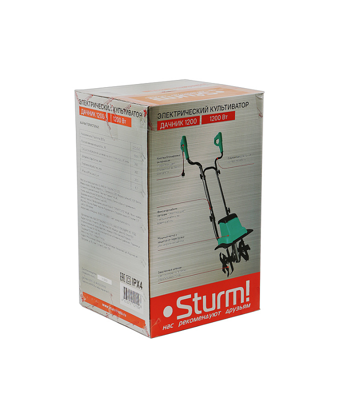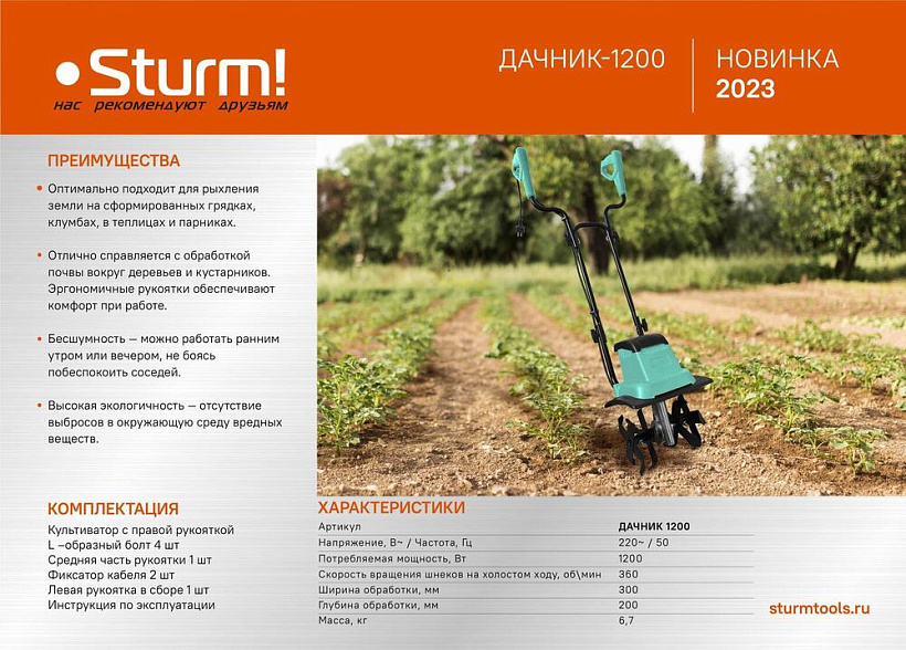 Sturm ДАЧНИК 1200 – малогабаритный электрический культиватор – предназначен для рыхления верхнего слоя почвы, без его переворачивания, на сформированных грядках и клумбах, в теплицах и парниках. Позволяет быстро и качественно подготовить землю перед посадкой семян или рассады, способствуя лучшей вентиляции корневой зоны, улучшению структуры почвы, уничтожению сорняков. Важными достоинствами культиватора с питанием от электросети являются его высокая экологичность, малый уровень шума, а также максимальная простота использования: в отличии от бензиновых аналогов, электрический культиватор не требует подготовительных операций при запуске. Модель обладает умеренными габаритными показателями и относительно небольшой массой, что обеспечивает высокую маневренность, и отличный контроль в процессе работы. Культиватор Sturm ДАЧНИК 1200 оснащен производительным 1200 Вт двигателем и мощной четырехсекционной почвофрезой, что позволяет производить обработку почвы на глубину до 200 мм. Ширина захвата за один проход составляет – 300 мм. Благодаря наличию складных рукоятей, модель удобна при транспортировке.