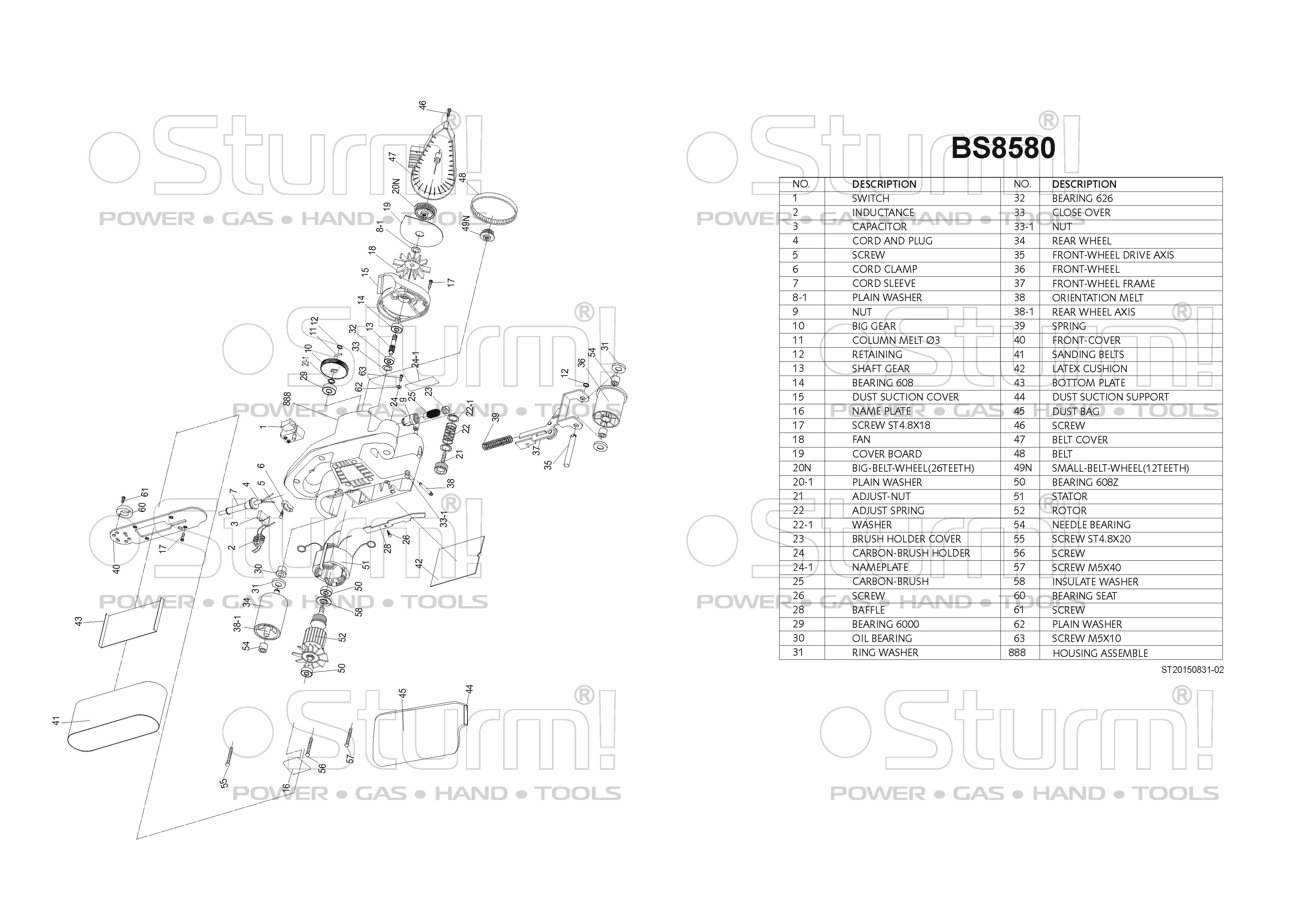 Sturm BS8580 – универсальная и производительная ленточная шлифовальная машина, рассчитанная под использование шлифовальной ленты размерностью 76х533 мм – предназначена для грубого и чистового шлифования плоских и выпуклых поверхностей, в том числе значительных по площади. Модель оснащена мощным 800 Вт электромотором, позволяющим развивать скорость вращения ленты в 380 м / мин, обеспечивая высокую производительность, а также качество работы: заложенный запас мощности способствует ровному поступательному ведению инструмента и эффективной обработке материалов с повышенными требованиями по качеству. Выверенные массово-габаритные показатели обеспечивают удобство в использовании, а низкий центр тяжести – устойчивость шлифмашины и лучший ее контроль при работе. Для максимальной простоты эксплуатации модель получила функцию автоматического центрирования, благодаря которой шлифовальная лента после включения машины позиционируется точно по центру и удерживается в правильном рабочем положении. При необходимости, донастройка ленты может также производиться с помощью специального регулировочного винта. Предусмотренная конструкцией система крепления шлифовальной ленты с помощью зажимного рычага значительно экономит время, необходимое для замены оснастки. Также, легкости обслуживания инструмента способствует наличие функции быстрого доступа к щеткам, позволяющей производить их замену без демонтажа элементов корпуса. В штатную комплектацию модели входит вместительный мешок-пылесборник.
