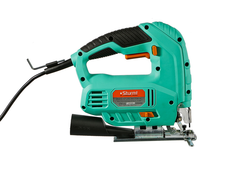 Sturm JS4061P – компактный и практичный электрический лобзик. Инструмент характеризуется небольшими массово-габаритными показателями и выверенной эргономикой – надежен в хвате и отлично контролируется даже одной рукой. Модель оснащена 800 Вт электромотором и мощной механической частью, благодаря чему демонстрирует достаточно высокие показатели по максимальной глубине пропила: до 100 мм в древесине и до 10 мм в металле. Наиболее точно настроить инструмент применимо к конкретному материалу позволяет электронная регулировка количества ходов штока (800 ¬– 3000 ход / мин), а также функция маятникового хода с четырьмя режимами – с помощью специального переключателя пользователь выбирает оптимальный режим работы с упором на максимальную производительность, либо максимальное качество реза с наименьшим количеством сколов. Для удобства пользователя на инструменте установлен механизм безыинструментальной замены полотна, за счет чего смена оснастки производится максимально быстро и просто, без необходимости применения специального ключа. Дополнительный комфорт при работе обеспечивают фиксация пусковой клавиши, прозрачный защитный щиток, а также возможность принудительного выдува опилок с рабочей зоны для лучшего обзора линии реза. При необходимости, возможно подключение к инструменту строительного пылесоса.