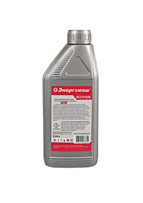 ЭНЕРГОМАШ МСЭ-0102Б  – всесезонное минеральное моторное масло нового поколения. Предназначено для двухтактных бензиновых двигателей воздушного охлаждения (с предварительным смешиванием топлива и масла) различных видов садовой техники: бензопил, мотокос, воздуходувок, газонокосилок, мотокультиваторов, мотоопрыскивателей и т д. Гарантирует надежную и долговечную работу двигателя и минимизирует необходимость частого технического обслуживания и ремонта. Предотвращает преждевременный износ и перегрев цилиндропоршневой группы, снижает образование нагара и отложений, закоксовывание поршневых колец, калильное зажигание, способствует уменьшению дымности и имеет низкую зольность. Благодаря наличию специального пакета присадок минеральное масло СОЮЗ МС2-0102Б обеспечивает облегченный запуск двигателя даже в условиях низких температур. Поставляется в пластиковых канистрах объемом 0.946 л.