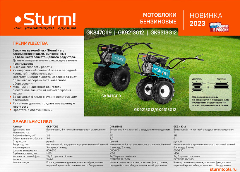 Мотоблок бензиновый Sturm! GK847CI19 — 3-х скоростная модель (понижающая, основная и повышающая) с чугунным редуктором и формованными крыльями, на внушительных колесах 19*7-8.